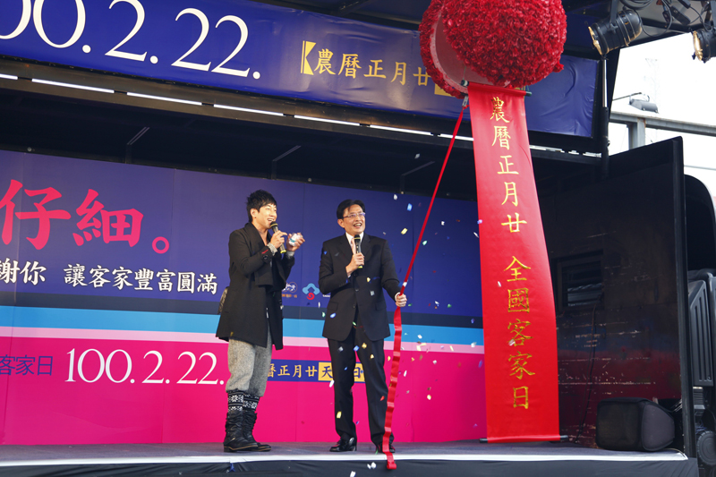 民國100年2月22日,也是首次的全國客家日,為了歡慶這個屬於客家族群日子的到來,19日在台北市新舞台特別用具客家特色的擊鼓、舞蹈、山歌等方式舉辦第一屆「全國客家日藝文晚會」慶祝。總統馬英九出席祝賀時表示,訂定全國客家日彰顯了政府對客家族群的重視與感謝,他本身也是客家人,有責任傳承客家文化,希望大家都能繼續打拼發揚客家文化,維持客家族群地位。