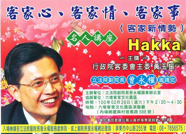 黃主委指出,根據客委會最新的調查顯示,在臺灣具客家血緣及認同客家文化的客家族群約有600萬人,平均每4人就有1人是客家人,顯見客家族群的重要性。他說,臺灣沒有客家就不夠完整,客家文化展現了對臺灣多元文化的貢獻;另一方面,他也藉此機會,感謝全臺灣民眾,因為有全臺灣民眾的支持,客家才能豐富精彩。