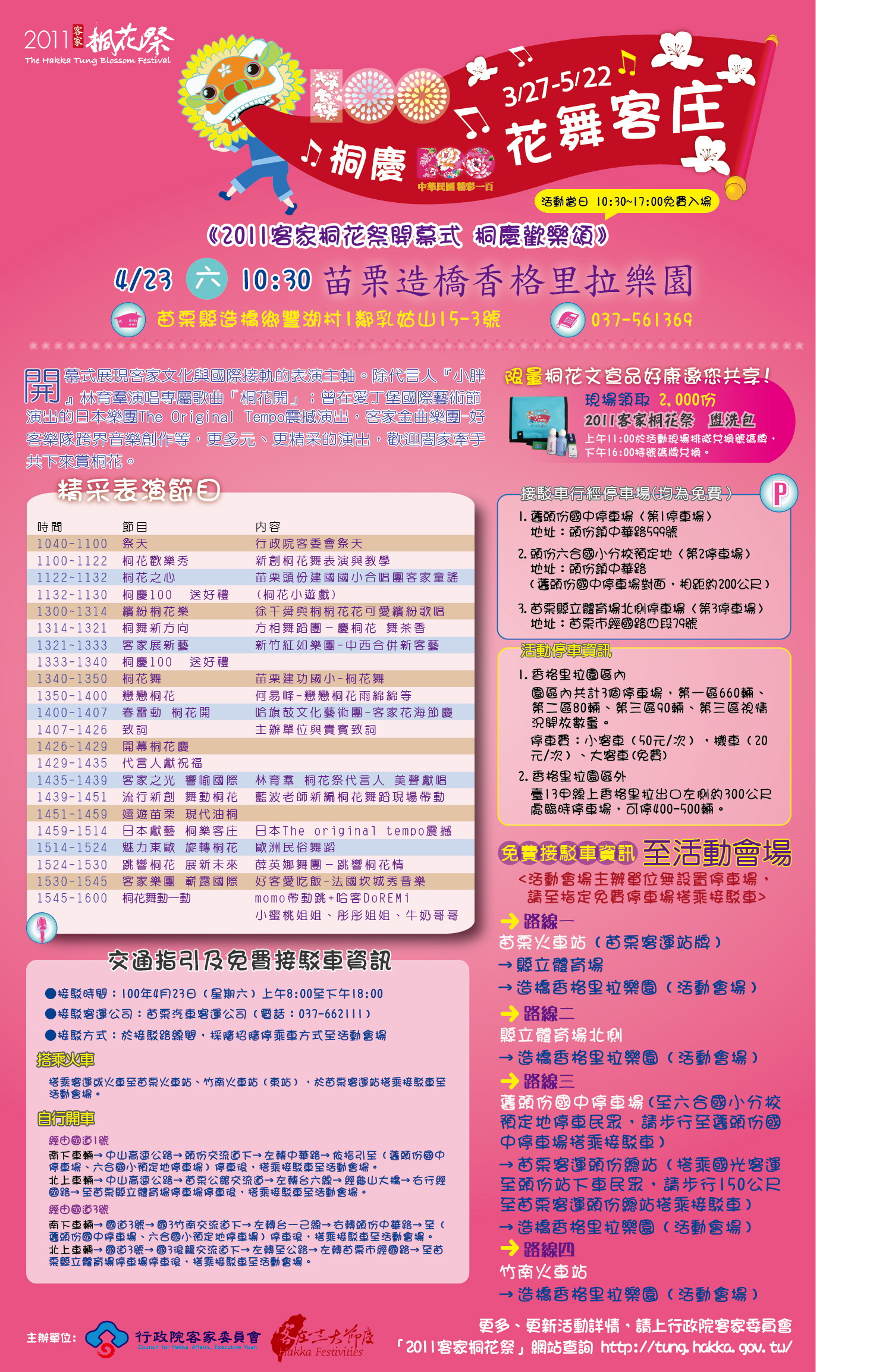 2011客家桐花祭開幕式「桐慶歡樂頌」將於4月23日(六),在苗栗造橋香格里拉樂園舉辦,為今年的桐花祭正式展開序幕,園中桐花均已含苞待放,等待遊客的到來!建國一百年,超級貴賓將蒞臨現場,共同祈祝「客家桐花 臺灣桐發」,全場表演展現客家文化與國際接軌的主軸,精彩萬分。