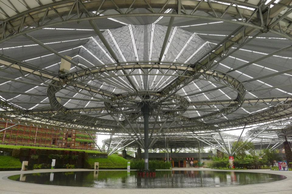 六堆客家文化園區坐落於屏東縣內埔鄉,面積約有 30 公頃,以客家生活與自然生態為雙主軸概念,分別規劃傘架客家聚落區、田園景觀區、自然草原區、九香花園景觀等四大主題,反映著六堆先民的開墾精神,更刻劃出與土地互動的歷史軌跡。其中,又以傘架客家聚落區為園區最鮮明的特色,象徵「為大地打傘遮蔭」概念,打造適宜人居的生活環境;傘架上更設置太陽能光電板,以綠色能源減輕地球負擔,不但符合現代節能減碳的環保概念,更與客家敬愛大自然的傳統觀念相結合。
