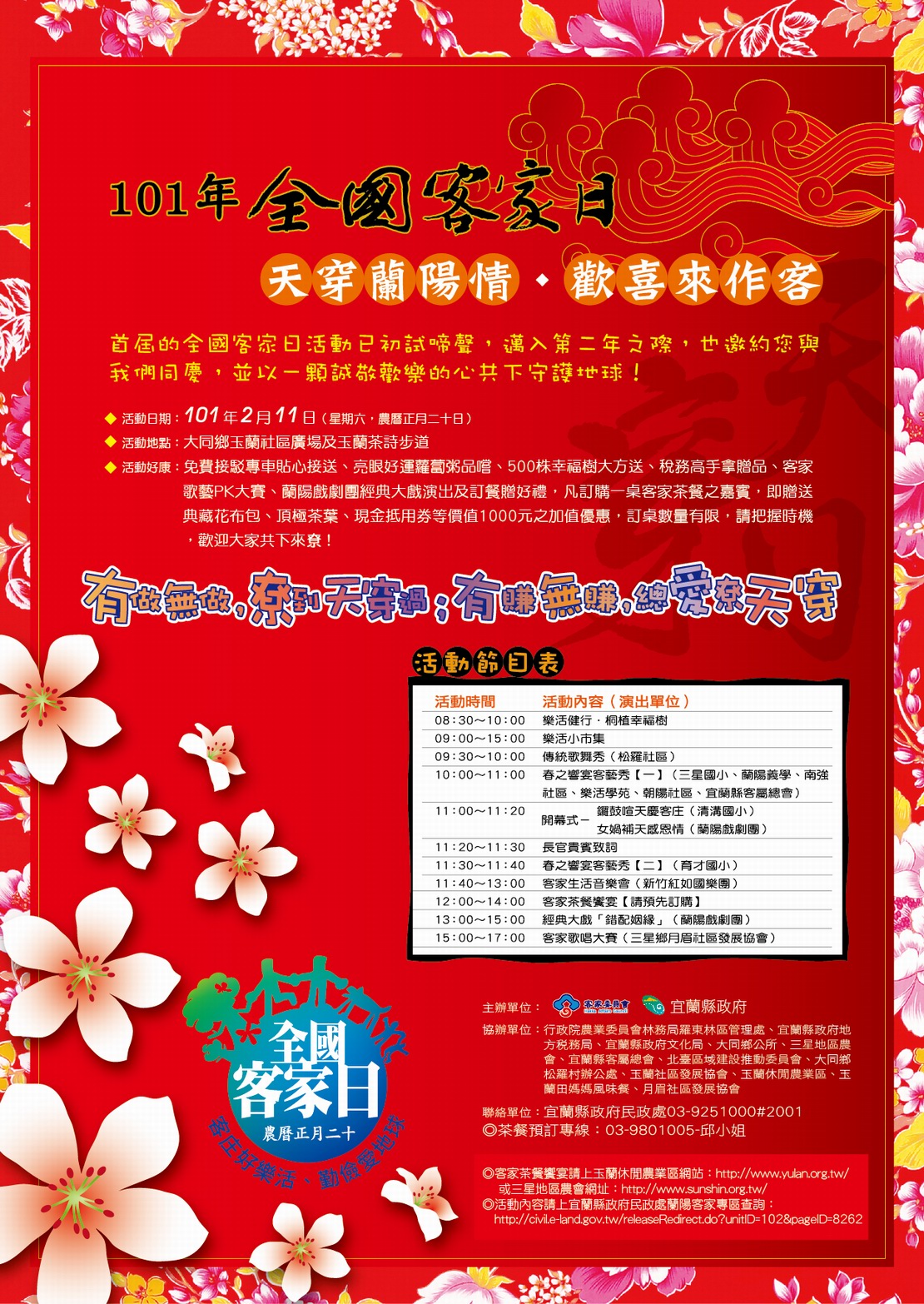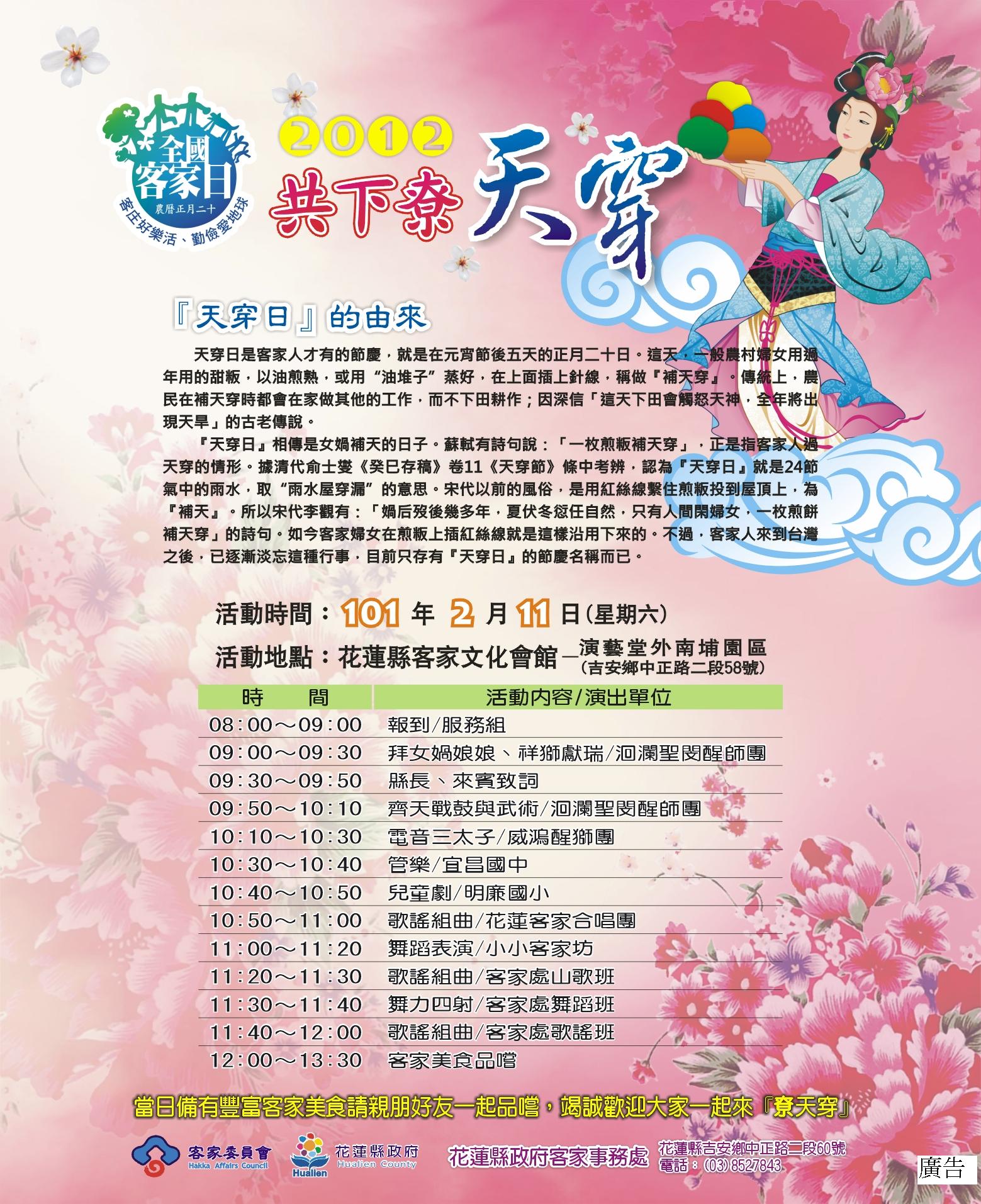 為扎根客家文化、帶動臺灣地方觀光及發展,客家委員會推動「客庄 12 大節慶」已邁入第四年,藉由各月主題活動的舉辦,結合現代臺灣客庄觀光資源,回顧客庄歷史及文化傳承,以期為臺灣的多元文化帶來更多對話及交流。 5 日開幕的「 2012 東勢新丁粄節」,在晚間 5 點舉辦精彩絕倫的「千人提燈化妝踩街嘉年華」;另外新丁粄擲筊祈福及鬪粄比賽等則在 6 日熱鬧登場,歡迎對客家文化有興趣的民眾造訪東勢,享受不一樣的元宵佳節!