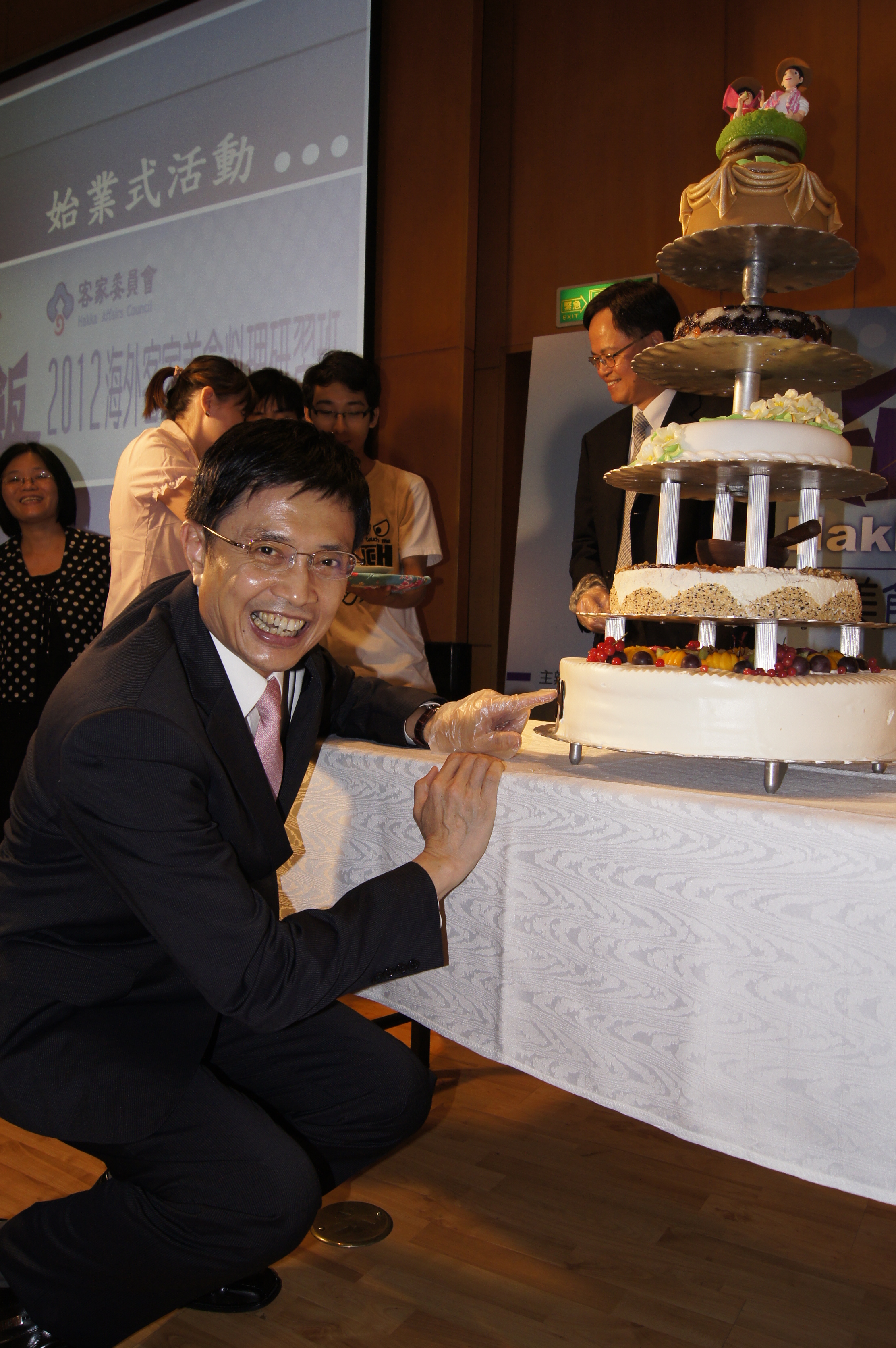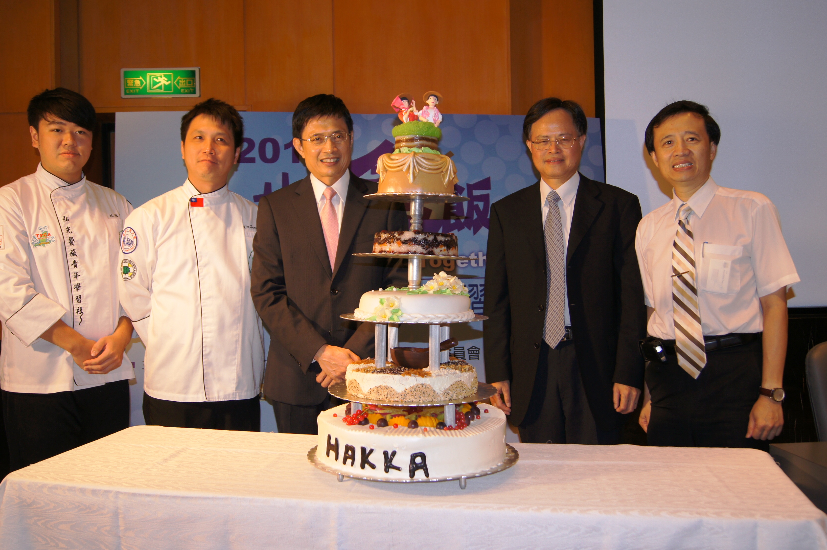 為歡迎遠道而來的客家鄉親,當天的始業式上,曾獲2010盧森堡世界餐飲大賽超級金牌獎的吳松濂老師和青年麵包達人林鴻恩以「新潮創意客菜:客菜西吃」為發想,以客家米食為食材,用西式烘焙法製成層層均別具意義的六層大發糕。從底部開始是客家柿餅為餡的「柿柿如意」蛋糕;第二層是鑲以擂茶食材(米香粒、花生、芝麻)為飾的「共好擂茶」;第三層是以麻糬為夾層,側面以桐花意象裝飾的「花好月圓」;第四層是用紅棗、蜜蓮子、花豆等食材製作「祈福八寶」;第五層用傳統客家甜糕灑上烘焙用金粉的「功成名就」;最頂層是客家傳統九層糕代表「高祿長壽」。黃主委在現場仔細端詳創意六層大發糕,對廚師的巧思和費工烘焙的手藝深表讚賞,黃主委並與僑務委會員林瑞隆處長、弘光科技大學方國權校長一同將巧克力製成的「HAKKA」字樣裝飾放上去,也期盼客家文化能傳承得更高、更遠。