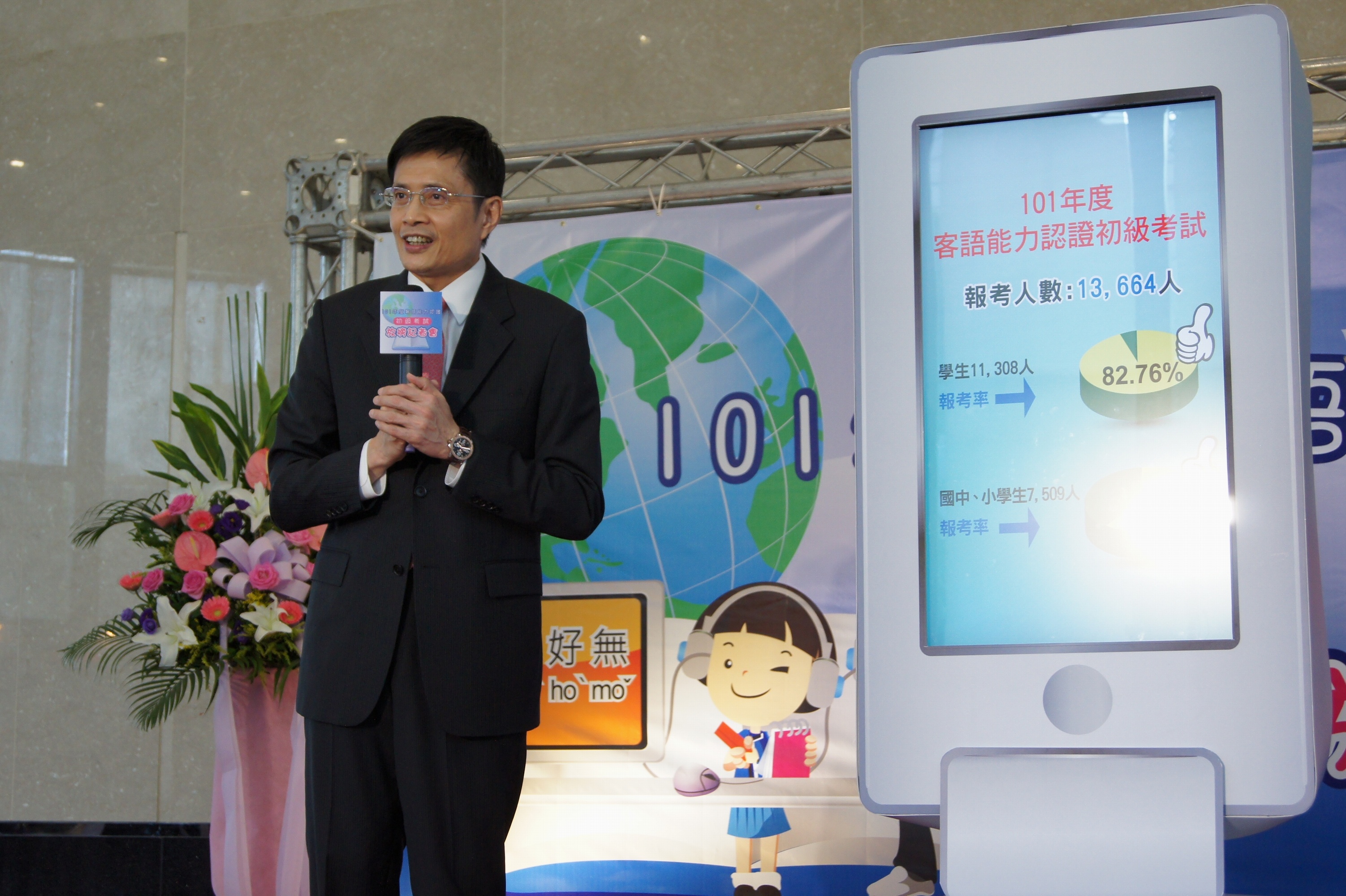 101年客語能力認證初級考試於8月26日在全國15考區、34所試場同步舉行,共有13,664名考生報名,年紀最小4歲、最大84歲,共計6,549人通過,黃主委特地從立法院趕回來張貼榜單。他說,稍早在立院備詢時,立法委員也都相當關心客語傳承的規劃與成果,從這次初級認證考試的成果看來,報考的後生越來越多,這些都是語言從小扎根的實證。為了傳承客語,客委會不斷創新突破,逐年推出各項獎勵措施,獎學金機制有效激勵學子學習客語風潮,今年5月客委會也首創全球年齡最小的「幼幼級客語闖通關」認證,102年度更將推出客語能力數位認證初級考試。
