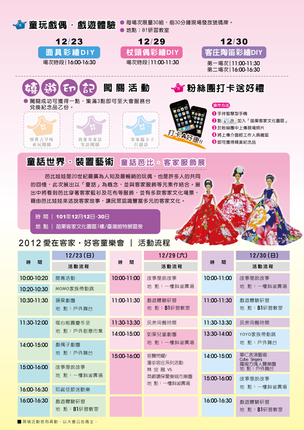 此外,現場還舉辦「名廚烹飪教室」活動,邀請到養生名人林秋香老師與客籍名廚劉仁華(阿華師)親自示範客家飯篼料理的創新好滋味;更有內容精彩多元的「親子趣味飯篼比賽」、「藝文表演活動」、「客家特色商品展售會」、「飯篼DIY」及「翫食力趣味遊戲」等活動,讓民眾一次體驗好吃、好看、好聽、好玩的客家文化丰采。