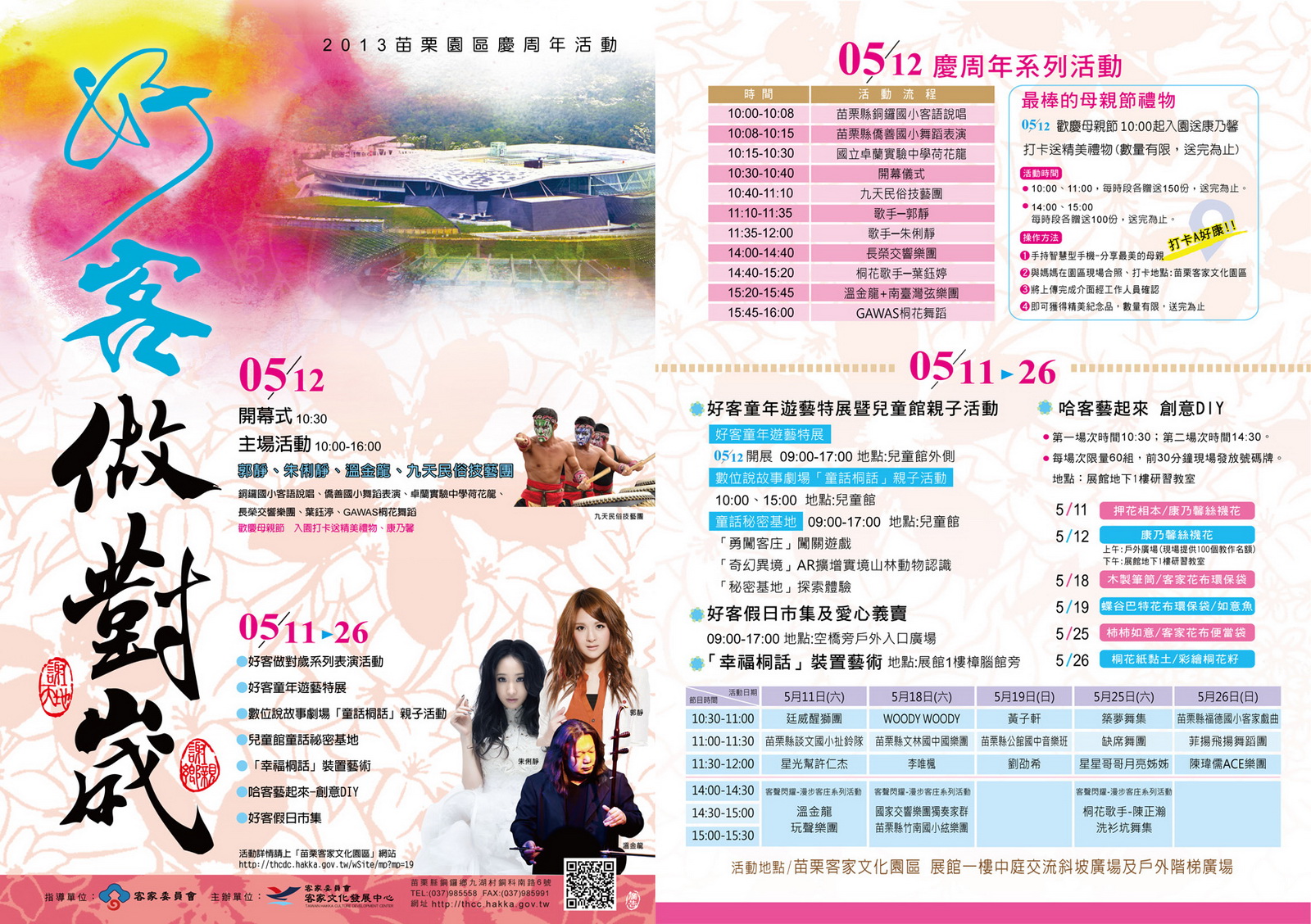 其中最盛大的周年慶主場活動「好客做對歲」,將在5月12日母親節當天登場,為了歡慶周年,同時送給每個入園的母親「最棒的母親節禮物」,當天園區邀請了純愛教主-郭靜、客家新女神-朱俐靜演唱拿手歌曲,知名客籍二胡演奏家溫金龍、九天民俗技藝團、長榮交響樂團、2013年桐花歌手葉鈺婷、GAWAS桐花舞蹈,還有卓蘭實驗中學荷花龍、銅鑼國小說唱藝術、僑善國小舞蹈班等在地團隊帶來精彩多元的演出。為了邀請鄉親闔家蒞臨共賞,園區除了安排精彩的表演節目外,也貼心的準備了好客小等路、康乃馨要贈送給與會的媽媽、遊客們,期望塑造周年慶與母親節幸福、溫馨的活動氛圍。