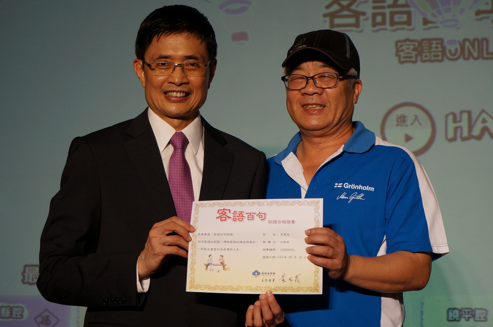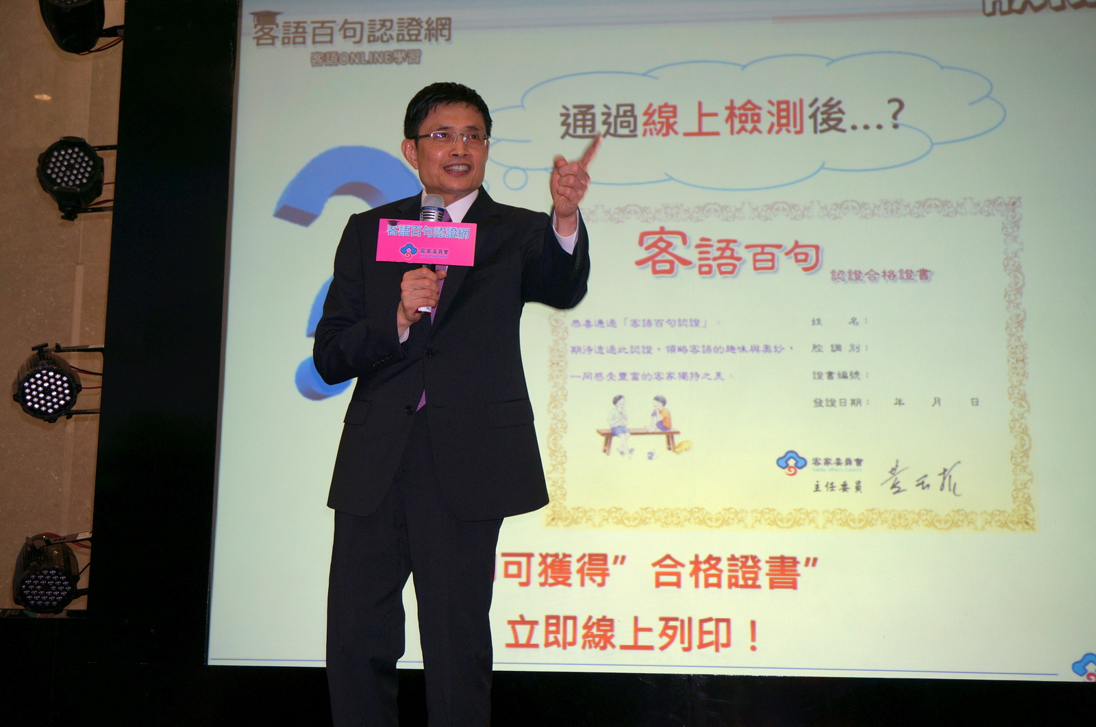 為鼓勵客語普及化,客委會經過縝密規劃與反覆測試後,建置「客語百句認證網」,5月10日下午舉行上線記者會,由黃主委親自啟動,提供民眾更便利的客語學習環境。黃主委表示,5月10日是客語能力認證考試的重要里程碑,客語認證由「手工時代」跨向「機器時代」,由人工施測及閱卷進化到網路作答與評量,不但可大幅節省人力及物資浪費,更可減少紙張印製而達環保目的。黃主委強調,「客語百句認證網」啟動後,任何人在任何時間、任何地點都能學習客語,還能透過即時線上檢測,了解自己的客語能力,是客語學習的重要進展。