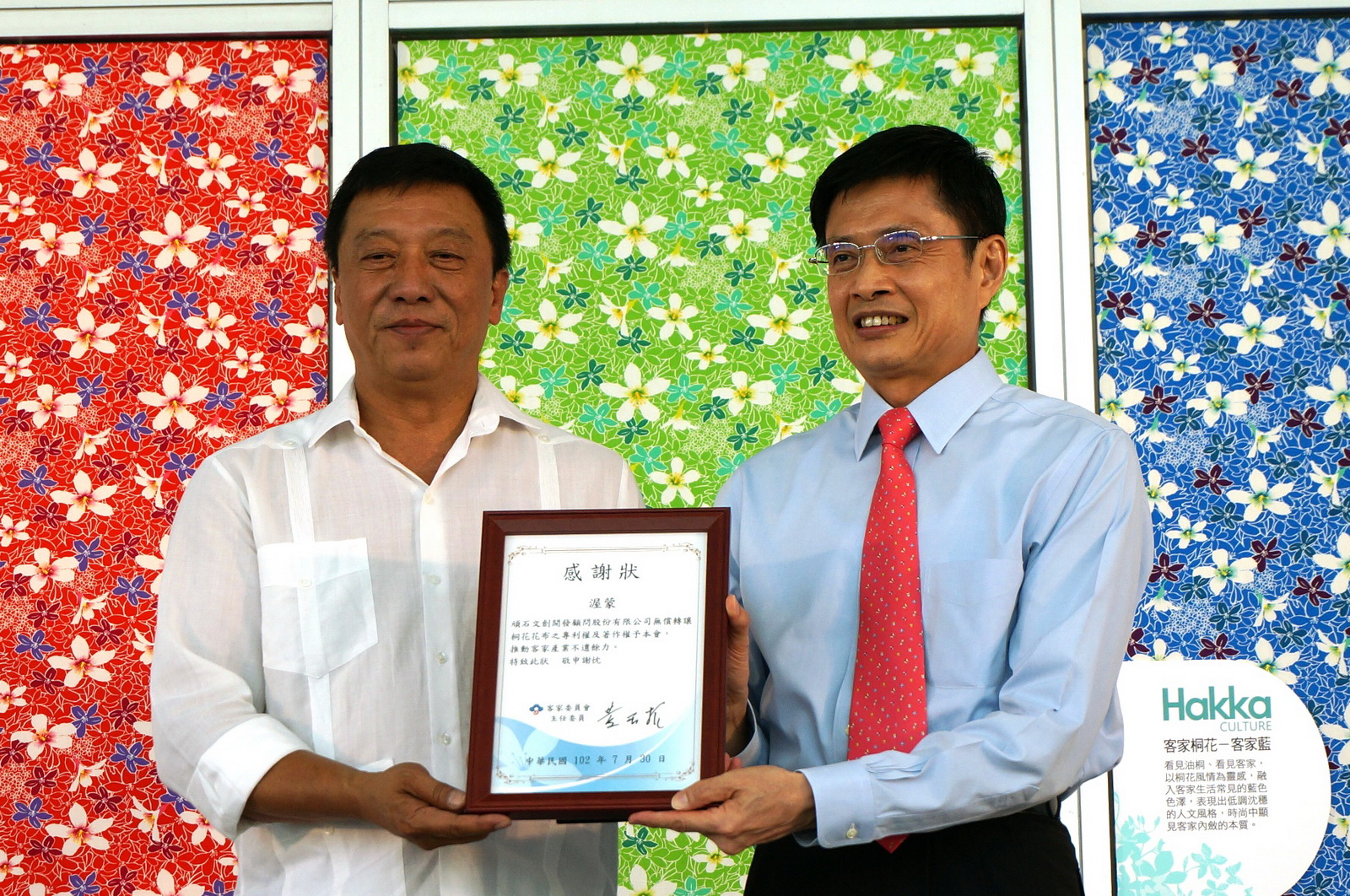 黃主委同時也向這次無償讓與客委會3款桐花花布專利及著作權的頑石文創公司李天鐸董事長、長期協助客委會開發客家衣飾布料的林國基設計師、特地到場參與發表會的台灣區織布工業同業公會謝海瑞理事長,以及許多的業者代表,表達謝意,也期許未來在大家的努力下,讓客家花布更具有市場及文創的競爭力。