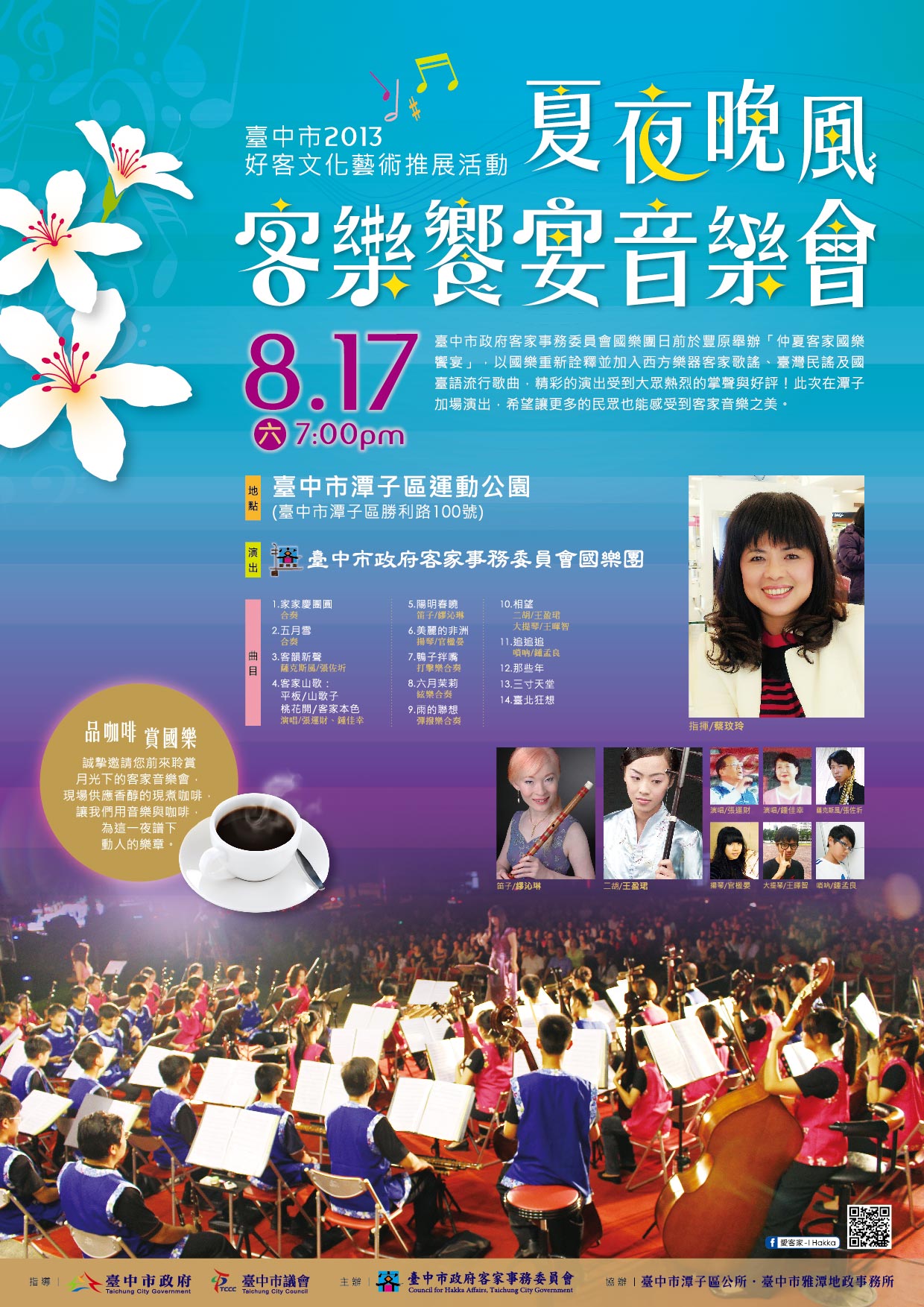 傍晚時分,將在樹蔭繚繞的林蔭大道舉辦「共下食飯 義起幸福」的活動,邀請新莊區300位長者,在夏風徐徐的夜晚,享受一邊食飯一邊鬥嘴鼓的樂趣;緊接著登場的「新莊愛響之夜」,除新北市客屬社團理事長將粉墨登場,表演「老萊子與小辣妹共舞」的逗趣演出,節目中更邀請到早期紅透半天邊的歌廳秀主持人─澎澎,及超級模王大道有小鄧麗君之稱的張靜沄PK有客家鄧麗君之稱的陳雙,演唱客家歌曲及經典懷舊歌曲,節目精彩可期。