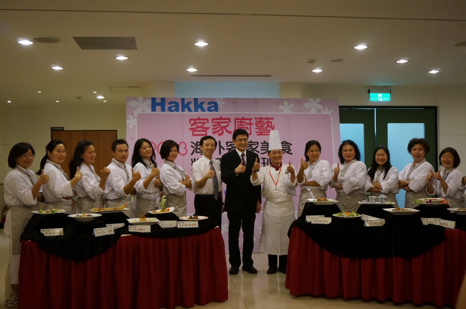 為將客家美食帶往國際舞臺,客委會自98年起舉辦「海外客家美食料理研習班」,從初階班到進階班、從一年1梯次到一年6梯次,越來越多海外鄉親盼能回臺習得道地的臺灣客家風味並帶回僑居地,讓親朋好友都能分享專屬於家鄉的好滋味。客委會主委黃玉振、弘光科技大學校長方國權,以及最受民眾愛戴的福容飯店主廚鄭衍基(阿基師)9月13日攜手出席「2013海外客家美食料理研習」初階班第四梯次結業式,分享學員們12天課程的精彩過程,也品嘗大家的精湛手藝。