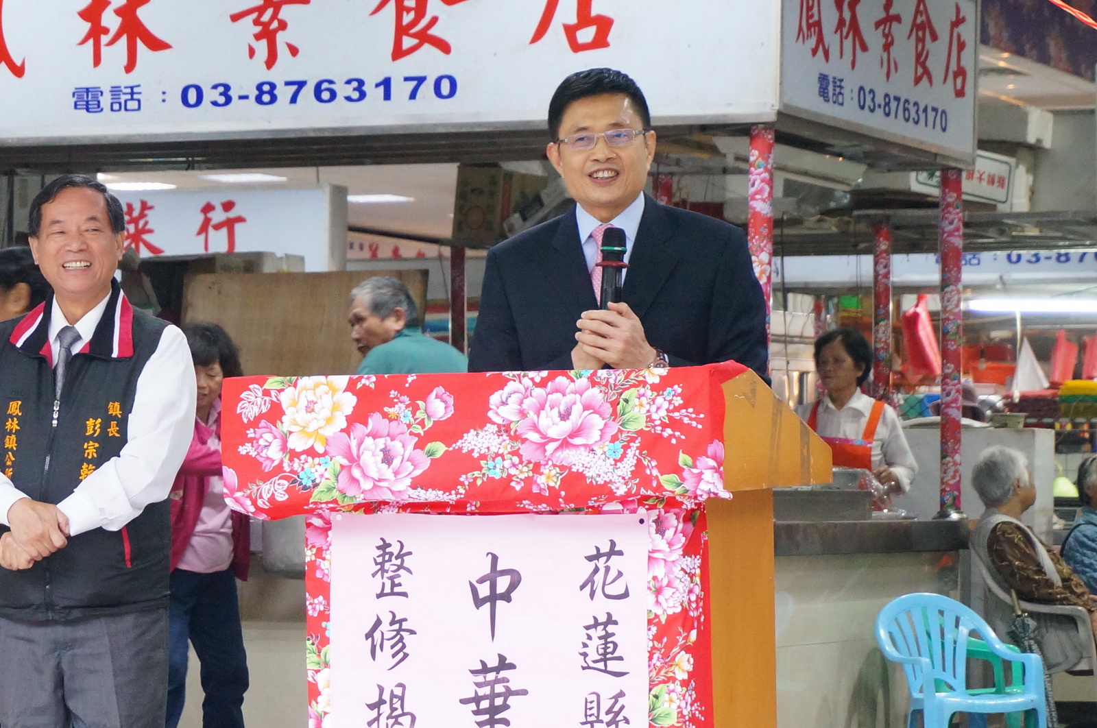 花蓮縣長傅崑萁致詞時特別感謝客委會對花蓮縣客家文化重點發展區的支持,尤其自98年以來,經濟部商業司不再補助各地傳統市場的改造,花蓮縣內許多保有客庄傳統生活風貌的市場紛紛面臨設備老舊或不敷使用的狀況,也多虧了客委會的補助,才讓這些保有客家庶民生活傳統的老舊市場,恢復原本的客家精神與面貌。