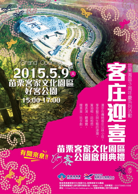 客家委員會苗栗客家文化園區開園已三年,將於104年5月9、10日及16、 17日兩個週末,舉辦「苗栗園區3周年慶系列活動」,104年以「客庄迎喜,好客成3」的活動主題,安排了金曲歌手、藝文表演、親子DIY ......《詳全文》 新聞快報 「臺灣客家特色商品通路授權推廣計畫」網頁正式上線 「臺灣客家好正點 通路展現好亮眼」網路推廣活動開跑~ 苗栗客家文化園區 1.客庄迎喜-苗栗客家文化園區公園啟用典禮 2.「客家女性生活藝像」典藏資源推廣活動 行政院政策廣告 1.叫我第1名─臺灣就業展望冠全球 2.TAIWAN GO 魅力 觀光創新高 地方活動 2015第二季臺南「客家學堂」開客招生囉 (臺南市政府民族事務委員會) 美濃客家學堂文化講座:從環境聚落發展談都市計劃的因應—以永安聚落為例 (高雄市政府客家事務委員會) 鬧熱打擂臺客家歌曲苗栗選秀會,竭誠歡迎報名! (臺中市政府客家事務委員會) 【全球客家串流計畫】徵選計畫簡章 (臺北市政府客家事務委員會) 104新北市客家童謠創作比賽 (新北市政府客家事務局)