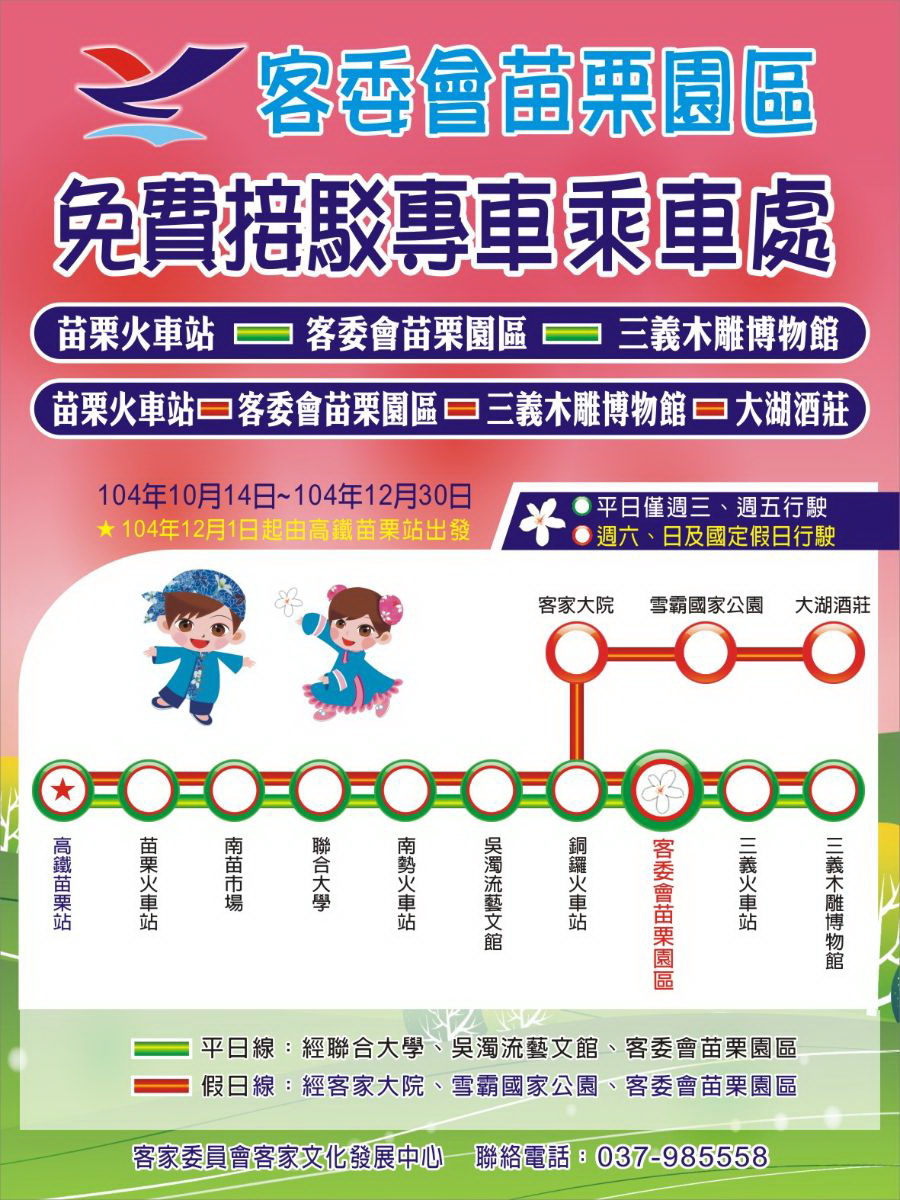 【苗栗園區】客委會苗栗園區免費接駁車,自10月14日起擴大接駁服務。