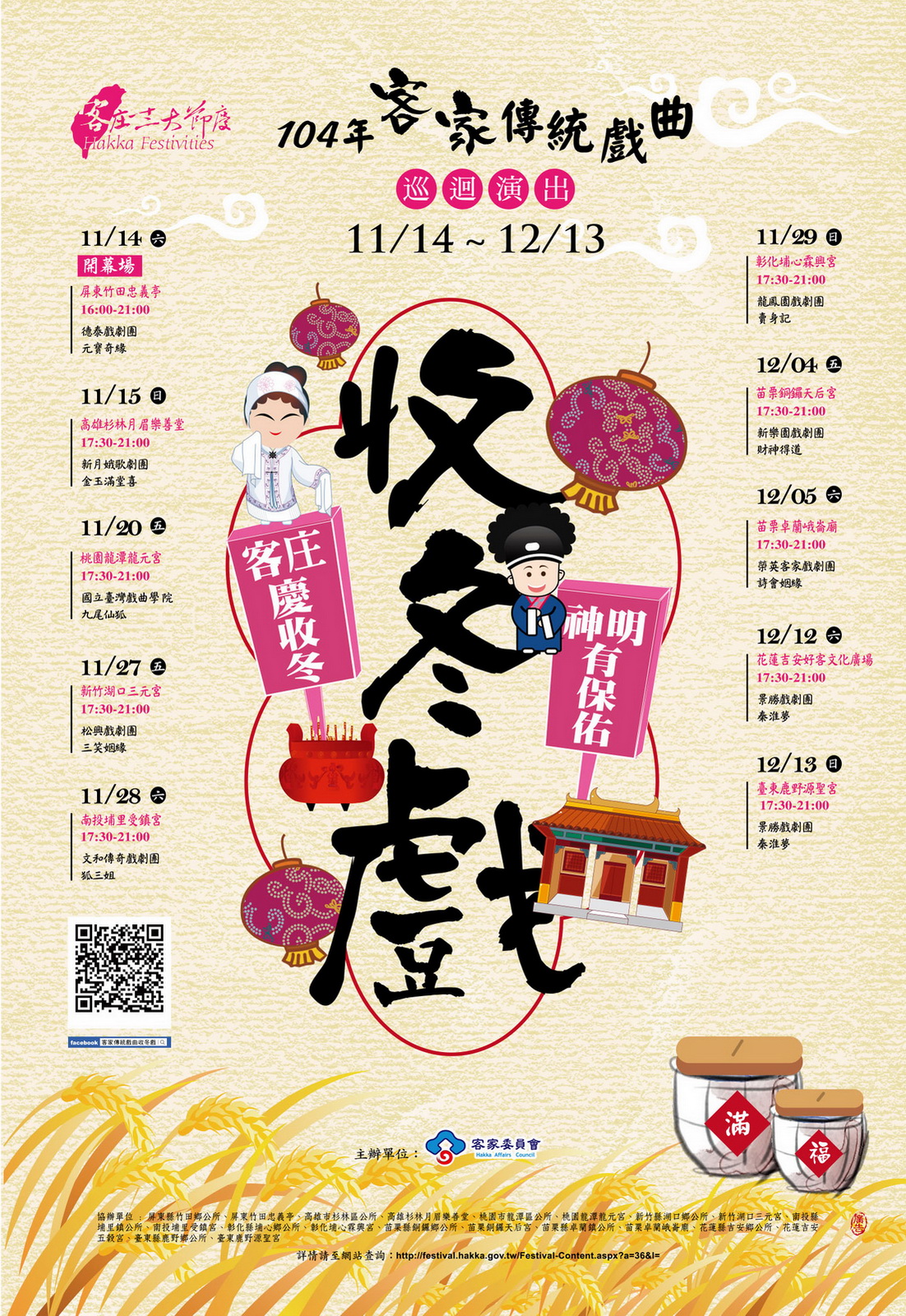 收冬戲是深具客家民俗、信仰、娛樂、交際、藝術與人文的表演藝術,也是客家委員會「客庄十二大節慶」的活動之ㄧ,104年客委會將安排11月至12月在全臺演出客家傳統大戲,邀請大家共下來欣賞!