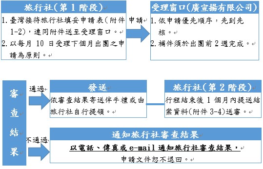 (一)凡領有綜合、甲種旅行社旅行業執照之旅行社於上開區域規劃旅遊行程招徠外籍遊客者,需在確定出團1個月前填妥「臺三線特色伴手禮申請表(如附件1)」、「旅遊團體明細表(如附件2)」及相關證明文件,並以電子郵件、傳真、郵寄或親送至受理窗口辦理(原則依申請優先次序發送)。