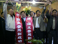 最後,由三十餘位客家社團代表獻上一人高特製的「選票」,預祝羅主委順利當選台北縣長,為離情依依的茶會,劃下圓滿句點。