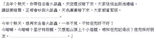 週休二日前的星期五晚上,清涼的空氣裡透著幾分浮躁,一向習慣晚餐後悠閒散步的村民們,心情可不平常。循著燈火通明處,走著走著,大夥竟不約而同地全踱到一處了。村民們排排坐在祠堂廣場的圓凳上,一邊與鄰座的鄉親閒聊話敘,一邊又自顧自地猛往前方門廊觀望,同時在心裡暗忖著這些忙上忙下的歌者,待會要唱些什麼歌?玩些什麼把戲?好奇永遠是凡俗生活中最撩人的心悸。