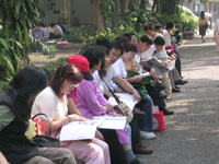 考場上,除有考生努力作最後衝刺,許多家長帶著小朋友一同準備考試的景象讓考場氣氛輕鬆不少;有的考生透露,他來參加考試是看到客語認證合格證書設計很漂亮,想擁有自己的證書;也有非客籍的考生表示,參加客語認證單純只為多學一種語言、豐富自己的生活。他們均認為研讀客委會刊行的客語認證基本詞彙與題庫兩本參考書對客語的聽說讀寫幫助很大。