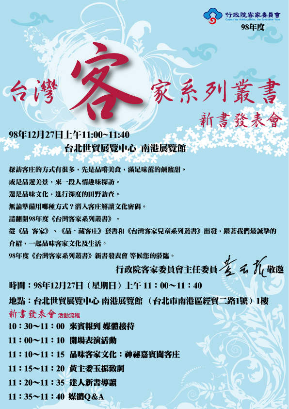 為在客家僑民的打拚基礎上,使更多人能認識客家族群,並持續推廣客家文化、勾勒未來願景,行政院客家委員會特於12月21日(一)舉辦「靜水流深──東南亞傑出客家人士研討會」;從客家人的海外發跡歷程出發,進而激發更多客家元素保存與發展的做法,使客家文化得以源遠流長。