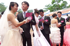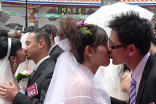 陽光灑落滿地溫馨,來自全台各地的99對新人相互交換愛的信物,許下愛的誓約,現場滿溢幸福氣息,觀禮民眾紛紛記錄下值得一輩子紀念的時刻。立法院長王金平表示,雪白桐花代表純真,象徵新人合組最美滿的家庭;行政院客委會主委黃玉振也祝福新人們百年好合、幸福久久,更笑說「希望大家增產報國,展現愛台灣的態度。」